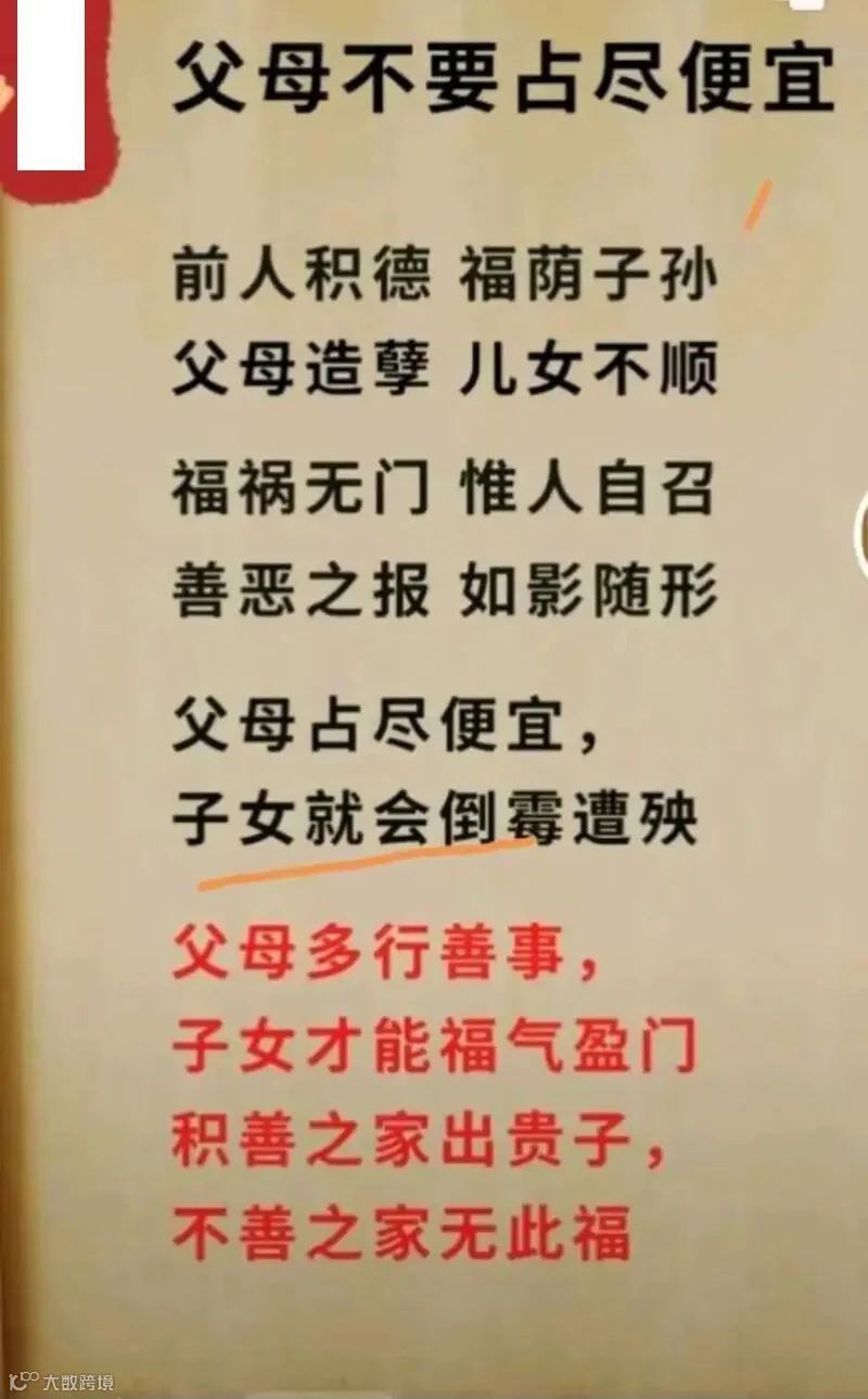 经上说 “任何人在未死以前,不要称他是有福的,因为从他的子女才能认识他的为人。”(德11章30)积善之家,必有余庆,庆及子孙;同样积恶之家必有余殃,殃及子孙。子孙的吉凶祸福,与祖上为人的善恶息息相关。