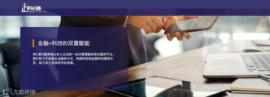 供E通是专门为佛山本土制造业客户打造的、融合科技与金融双重赋能的融资平台。平台围绕供应链深入企业的全生命周期,通过公司与银行联手,能精准解决中小微企业原材料采购等问题。同时中小型核心企业应收款、订单等可以通过进入平台,由平台负责对接银行以及小贷公司、保理等金融机构获取融资。平台对减轻企业负担、降低企业成本、改善营商环境都具有积极意义。