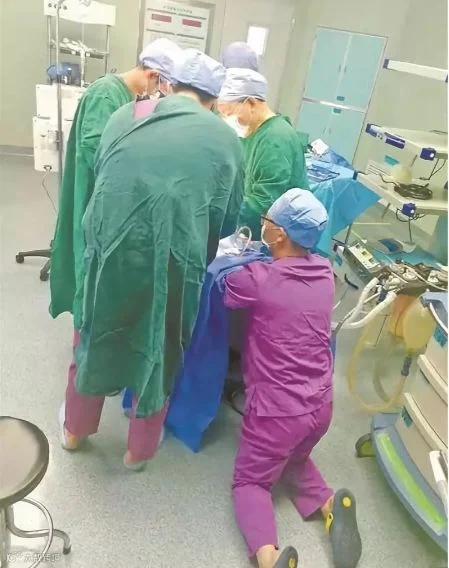 手术室里,一位医生为了避免患者头部在手术中晃动造成损伤,跪地扶着。