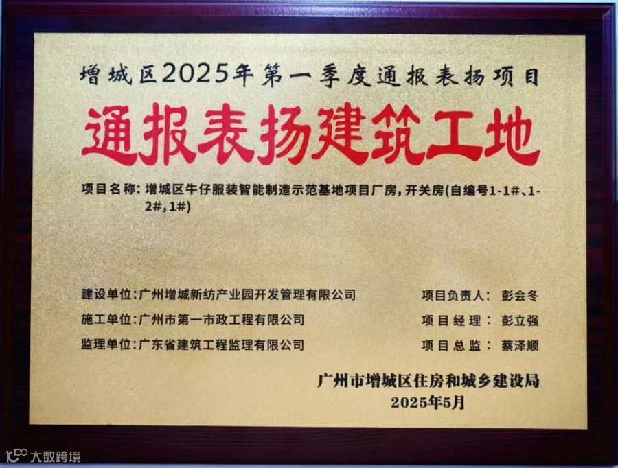 近日,广州市增城区住房和城乡建设局发布《关于2025年建筑工地第一季度质量安全文明施工检查情况的通报》,由增城城投集团直属企业广州增投产业投资有限公司全资子公司——广州增城新纺产业园开发管理有限公司开发建设的增城区牛仔服装智能制造示范基地项目,在增城区2025年建筑工地第一季度质量安全文明施工检查中从185个受检项目中脱颖而出,荣获“通报表扬建筑工地”的称号。