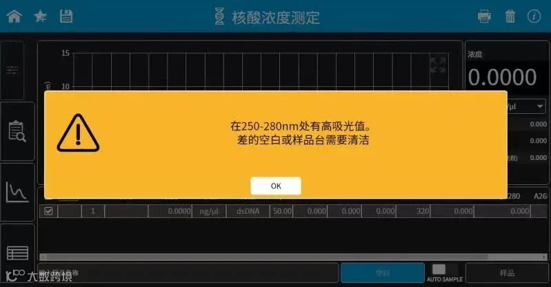 对于市面上绝大多数的超微量分光光度计而言,空白回测读数的正常范围通常小于±0.05A(10mm)。由于浓度读数涉及到不同样品的消光系数,因此通常看吸光值,如核酸测量时,看A260吸光值,蛋白测量时看A280吸光值。如果空白回测的值出现较大的正数或负数偏差,则说明存在问题。