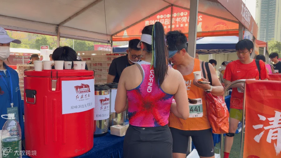摊位前,接过奶茶的跑者们纷纷点赞,浓郁的茶香、顺滑的口感、醇厚的底蕴,让大家在奔跑的疲惫中感受到满满的治愈。