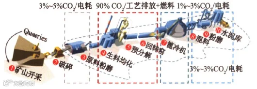 就目前普遍水泥生产工艺而言,二氧化碳排主要源于燃料燃烧和熟料的生产,其生产过程中生料预分解和回转窑两道工序又占了约90%的碳排。