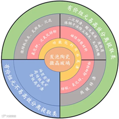 针对固废资源再利用过程应“因材施法”,东北大学资源与环境研究所薛向欣教授团队经过近二十年的技术攻关,突破了传统的低效能、高污染、低附加值的利用方式,系统地提出了固废资源从源头利用的方法、针对一些特殊固废的利用开发了成套关键装备及技术平台,实现了上述固废整体绿色增值化利用。发泡陶瓷和微晶玻璃具有导热系数低、强度高、容重低、防火阻燃、生态环保等优点,且应用范围广、需求量大、生产工艺相对简单,对上述有价组元含量低难提取的矿冶固废具有较大的消纳能力。根据发泡陶瓷或微晶玻璃的组成特点,通过调整多种固废的组成及比例与目标产品相匹配可制备出性能优良的发泡陶瓷和微晶玻璃产品。而对于有价组元含量高且易实现有价组元提取分离的矿冶固废可根据其自身特性进行对有价组元有效回收及回收后产生的固废用于生产其他高附加值材料,较好地解决了矿冶固废整体化、高效化、绿色化利用难的问题。本项目针对含钛高炉渣、高硅铁尾矿、钢渣、赤泥等有价组元难有效回收的固废,采取了直接整体利用的思路用于制备发泡陶瓷和微晶玻璃;针对烧结机头灰、瓦斯灰、沉泥、二次锌渣、酸洗废液、炼钢干法除尘灰、轧钢铁磷、热镀锌渣等二次资源固废,采取了对其中的有害或有价元素进行提取或直接利用制备其它功能材料,经提取或功能化利用后产生的固体废可用作生产发泡陶瓷/微晶玻璃的原料。