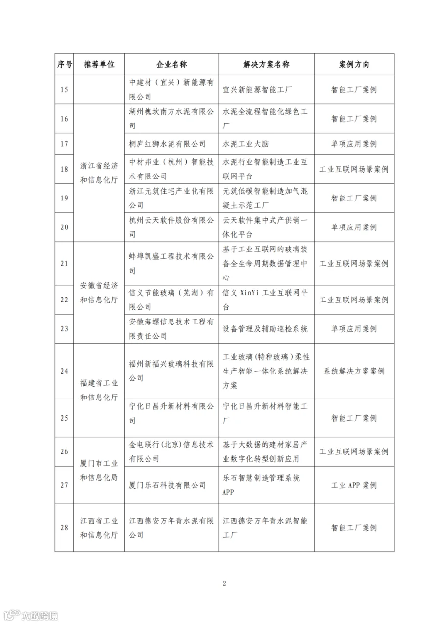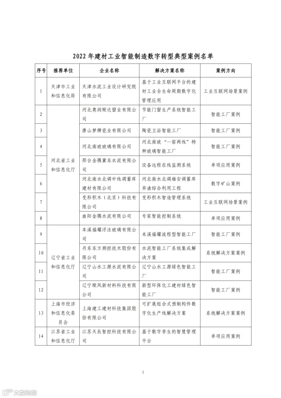 近日,经地方推荐、专家评审,原材料工业司发布2022年60个建材工业智能制造数字转型典型案例,涵盖信息技术供应商、系统解决方案、工业互联网场景、工业APP、智能工厂、数字矿山、单项应用等7个方向。发布案例是为了落实《建材工业智能制造数字转型行动计划(2021-2023年)》(工信厅原[2020]39号),在行业内形成一批可复制、可推广的成果,宣传推广经验做法,推动建材工业与新一代信息技术在更广范围、更深程度、更高水平上实现融合发展。这些案例具有一定的代表性,为建材工业智能制造提供了有益探索。