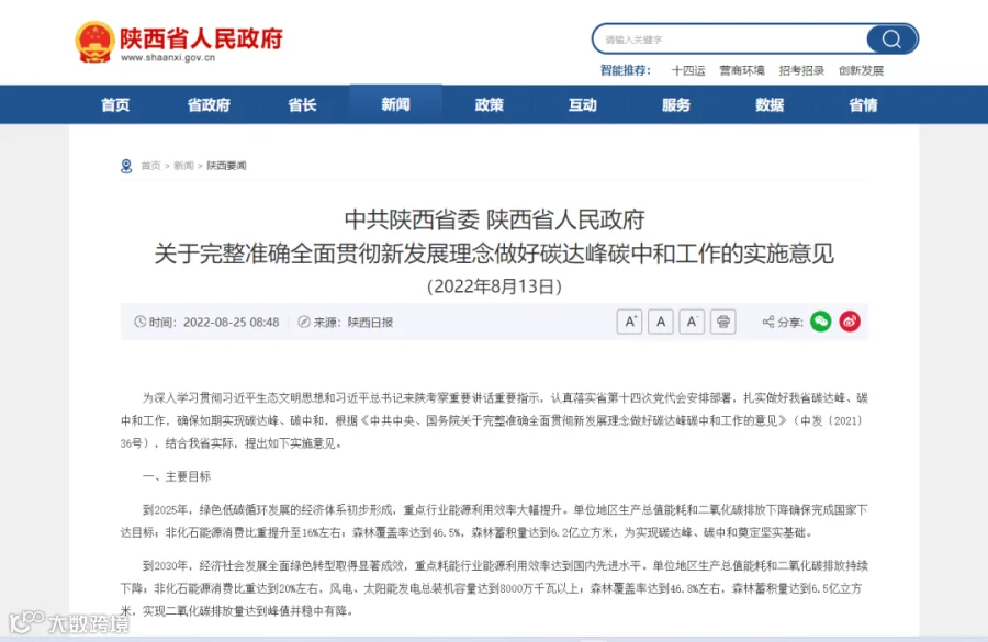 日前,陕西省人民政府出台了《关于完整准确全面贯彻新发展理念做好碳达峰碳中和工作的实施意见》,文件提出,到2025年,绿色低碳循环发展的经济体系初步形成,重点行业能源利用效率大幅提升。单位地区生产总值能耗和二氧化碳排放下降确保完成国家下达目标;非化石能源消费比重提升至16%左右;森林覆盖率达到46.5%,森林蓄积量达到6.2亿立方米,为实现碳达峰、碳中和奠定坚实基础。