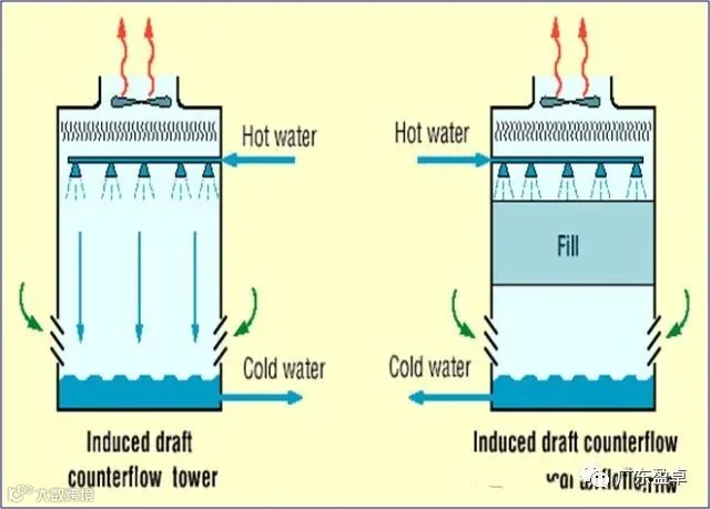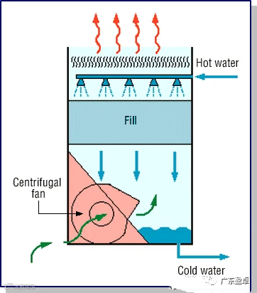 空气从底部强制吹入,在填料内与水接触蒸发部分冷却水,从而降低水温。