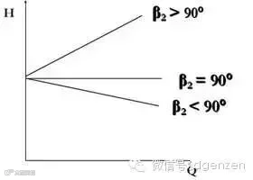 β2= 90º时,径向式,是一条水平直线,扬程不随理论流量的变化。