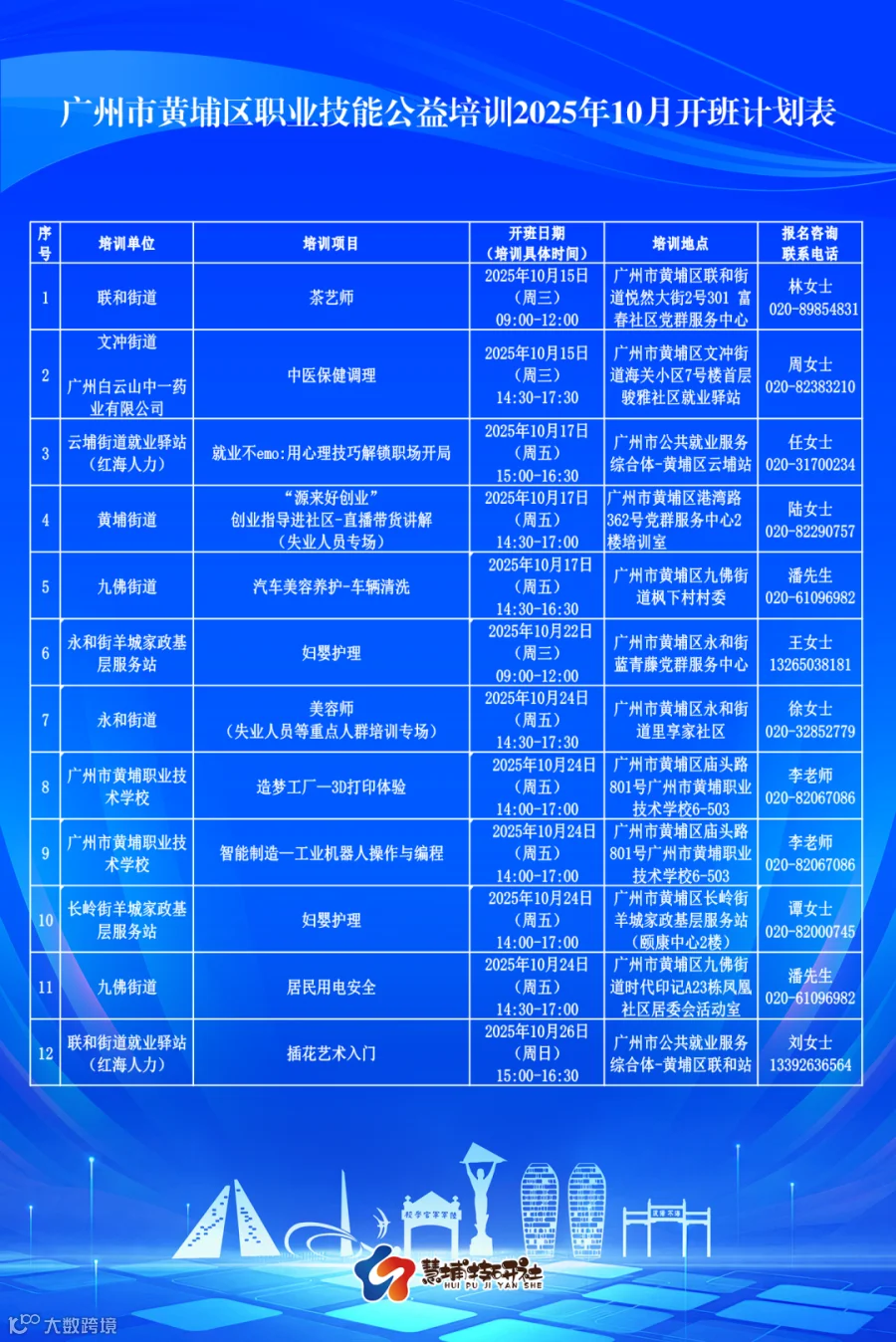 ▲上下滑动,查看黄埔区职业技能公益培训2025年10月开班计划表,培训安排最终以实际开展为准