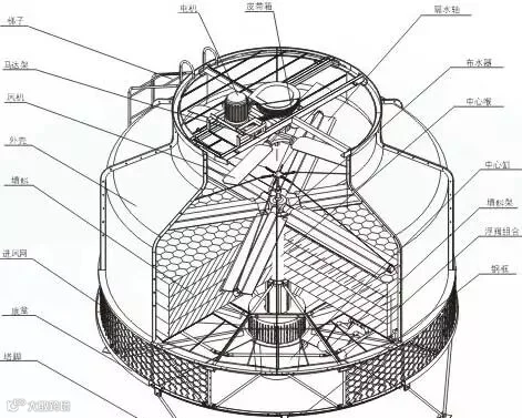 通常冷却塔的主体结构主要包括:电机、冷却风扇、布水器、填料、浮球控制阀、进风网、支架、外壳、溢水管,如果多塔并联使用几个塔之间还有平衡管。