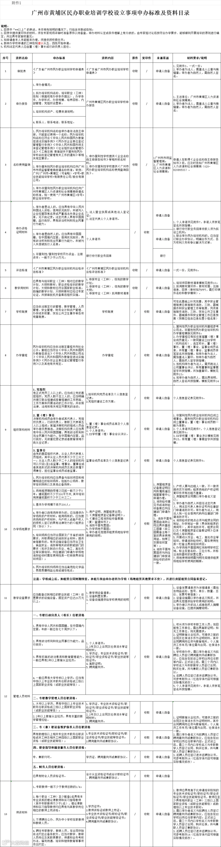 广州市黄埔区民办职业培训学校设立事项申办标准及资料目录详见下图,如需原件可点击附件下载,相关事项咨询请联系袁老师020-82086533、姚老师020-82228602。