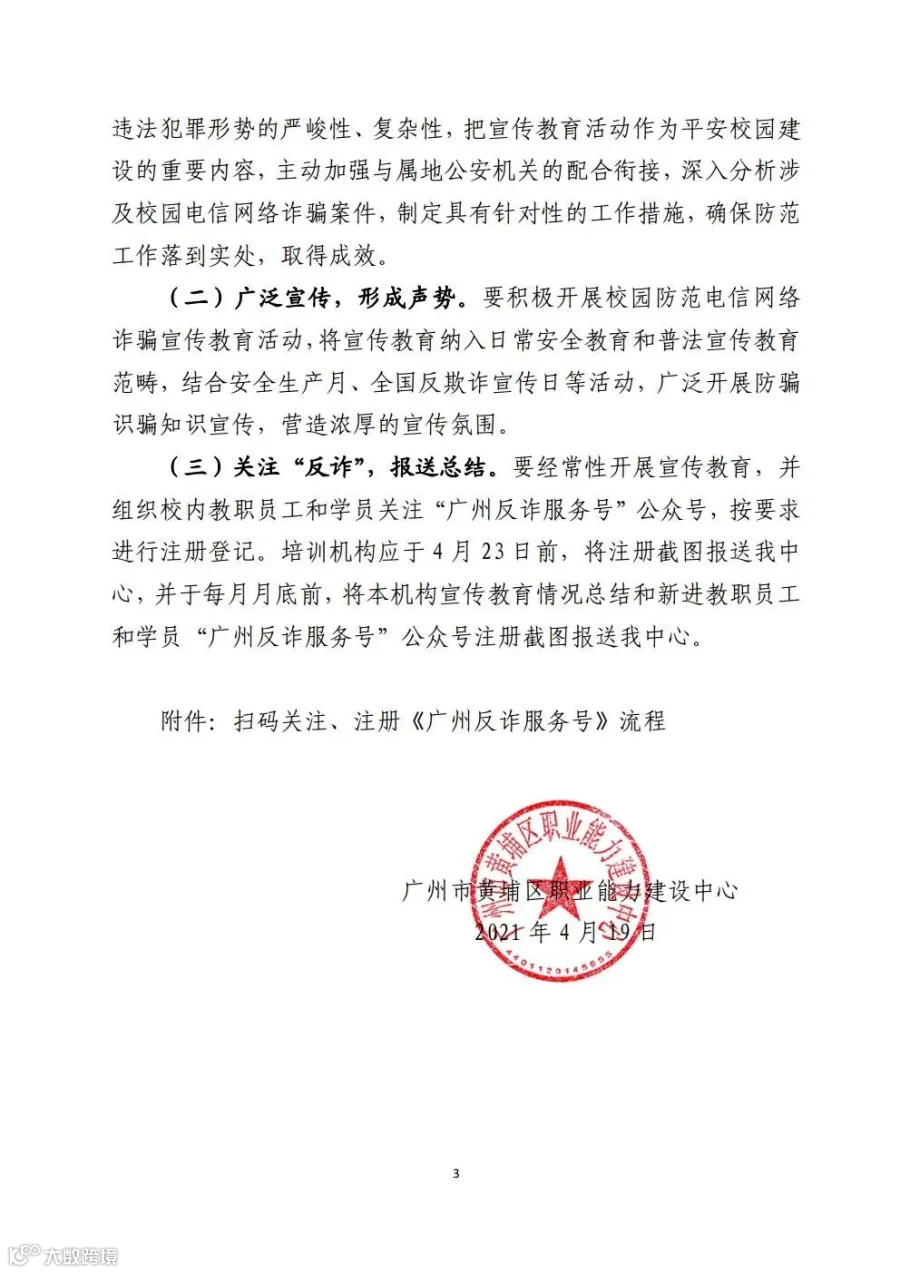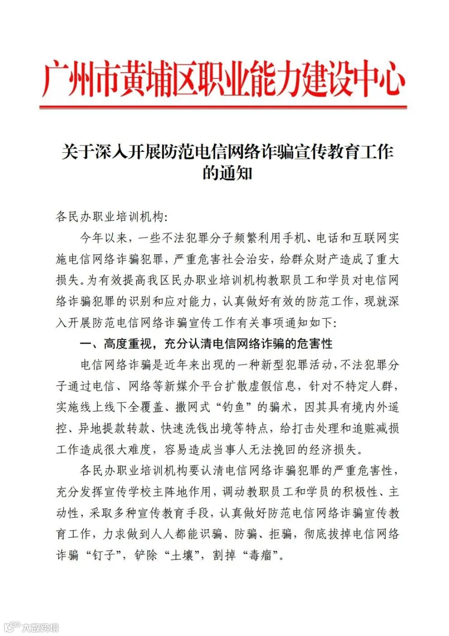 导读:为有效提高我区民办职业培训机构教职员工和学员对电信网络诈骗犯罪的识别和应对能力,认真做好有效的防范工作,现就深入开展防范电信网络诈骗宣传工作有关事项通知如下: