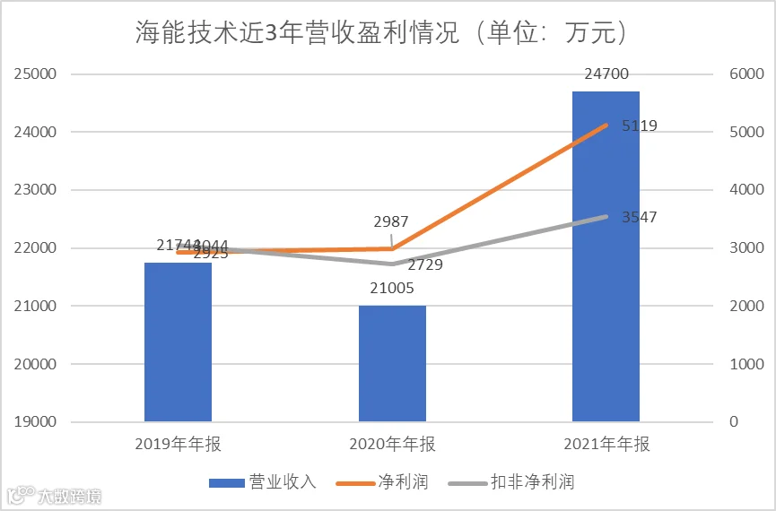 新三板企业海能技术(430476.NQ)于2022年4月14日公布2021年年度报告。2021年度公司实现2.47亿的营业收入,较上年同期实现增长17.59%;净利润5338万,较上年同期增长68.06%;扣非净利润3547万,同比增长34.41%。
