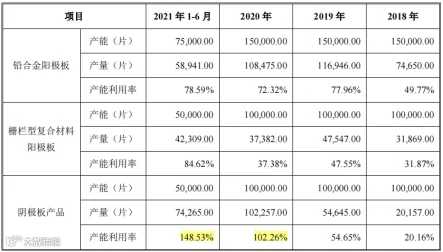 80%,目前已有产能已能满足销售生产需求。阴极板产品产能2020年至今一直处于满产甚至超产状态,2021年上半年产能利用率148.5%。因此,公司2021年持续建设“年产60万片高性能铝合金阴极产业化项目”,该项目2021年启动,项目建设完成后1-4年内分别实现15万片、30万片、45万片及60