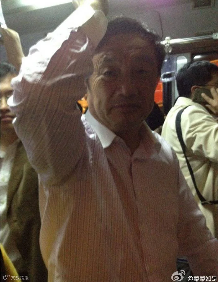 照片上,任总挤在拥挤的机场摆渡大巴上,右手抓吊环,左手扶行李箱,面容憔悴。