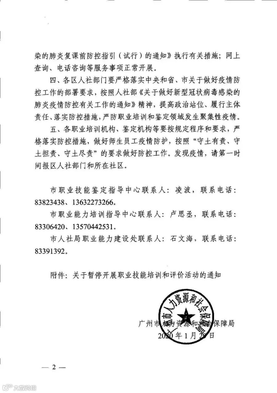 现将广州市人力资源和社会保障局《关于暂停开展职业技能培训、鉴定和公共实训等相关活动的通知》转发给你们,请各职业技能培训机构按照文件精神和我区防控工作要求抓好落实,及时调整培训模式,暂停一切人员聚集的职业技能培训等相关活动,并积极配合疫情防控部门,及时做好信息整理和报送等工作,发现异常情形或疫情,第一时间上报。