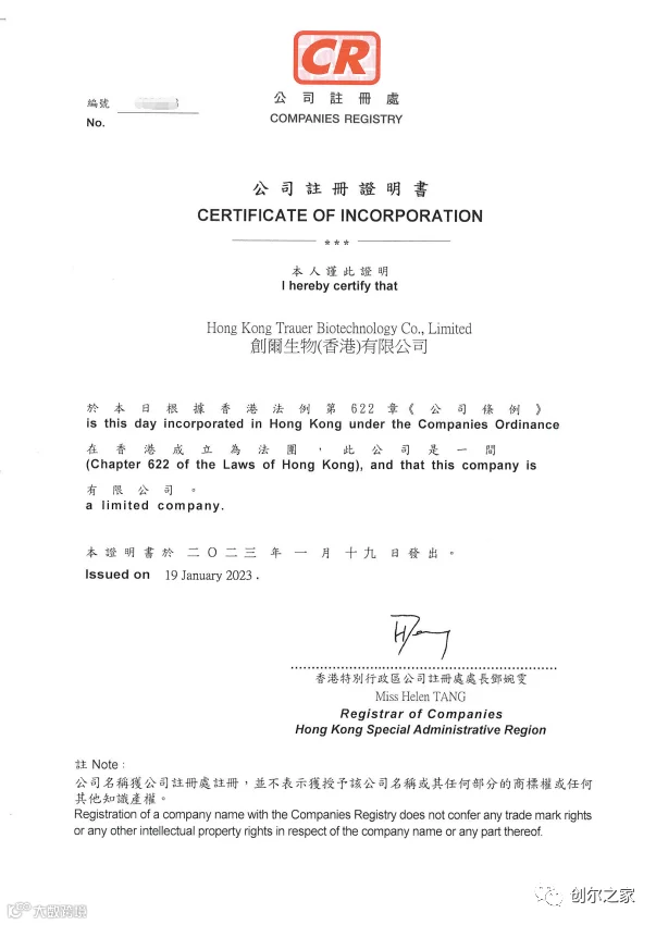 导读:热烈祝贺创尔生物(香港)有限公司注册获批