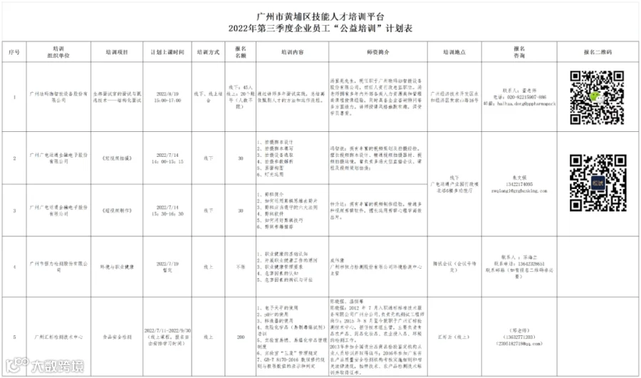 黄埔职建我区技能人才培训平台2022年第三季度公益培训课程计划如下,欢迎区内企业职工免费报名参与,报名咨询请致电相关联系人。