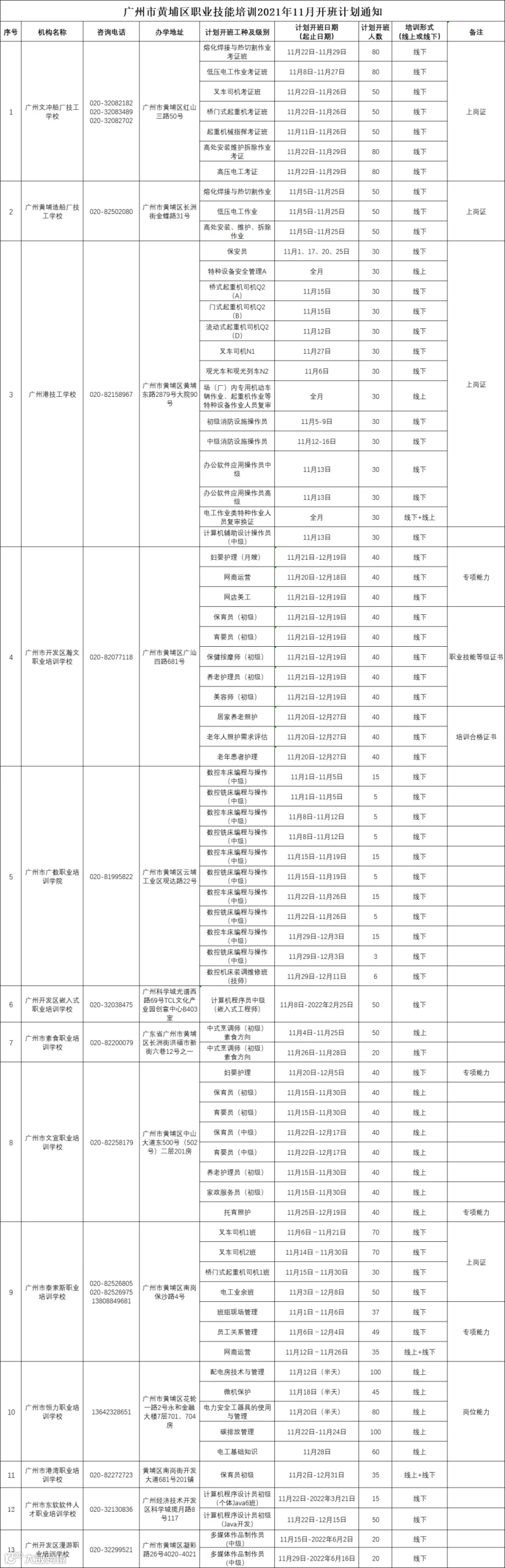广州市黄埔区职业技能培训2021年11月开班计划通知