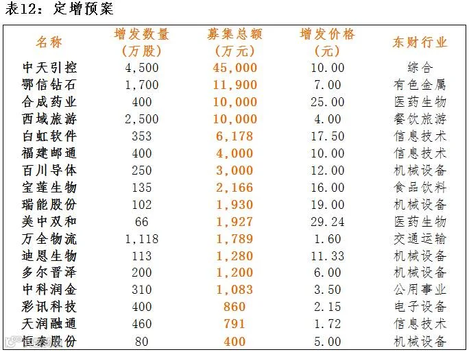 点评:4月13日,共有17家公司公布定增预案,总增发股数13086万股,共募集资金10.35亿元。4家募集资金达到一亿元,募集资金最大为中天引控,募集资金为4.5亿元。总体来看,募集金额流向综合和医药生物行业较多。