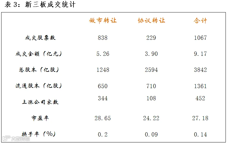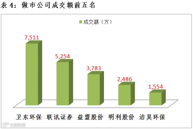 做市企业中有838只个股参与交易,成交额5.26亿元。其中344只个股上涨,387只个股下跌;8家做市企业成交额破千万,成交额前三名为卫东环保8581万、联讯证券5710万、明利股份3472万。