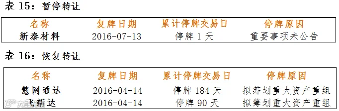1家公司暂停转让 2家公司恢复转让