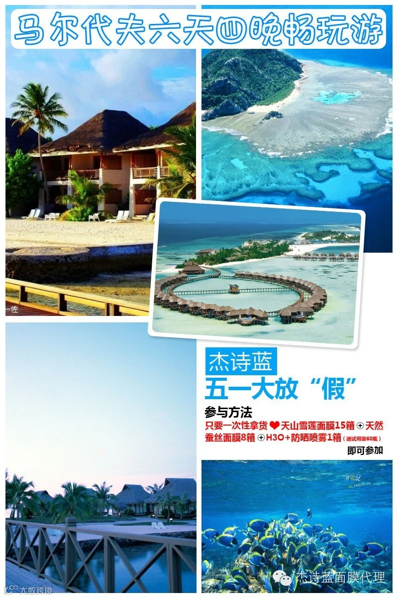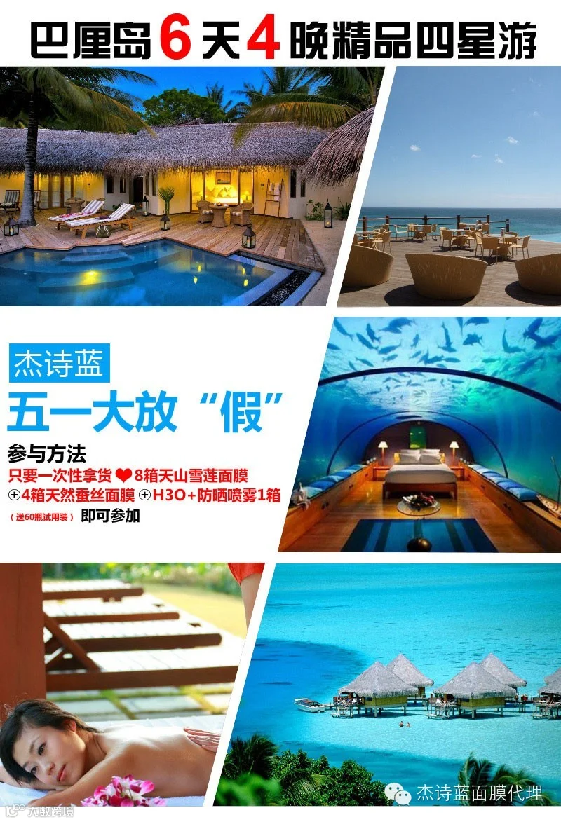 1.马尔代夫六日游:15箱天山雪莲面膜 + 8箱天然蚕丝面膜 + 1箱H3O+防晒喷雾(送试用装60瓶)