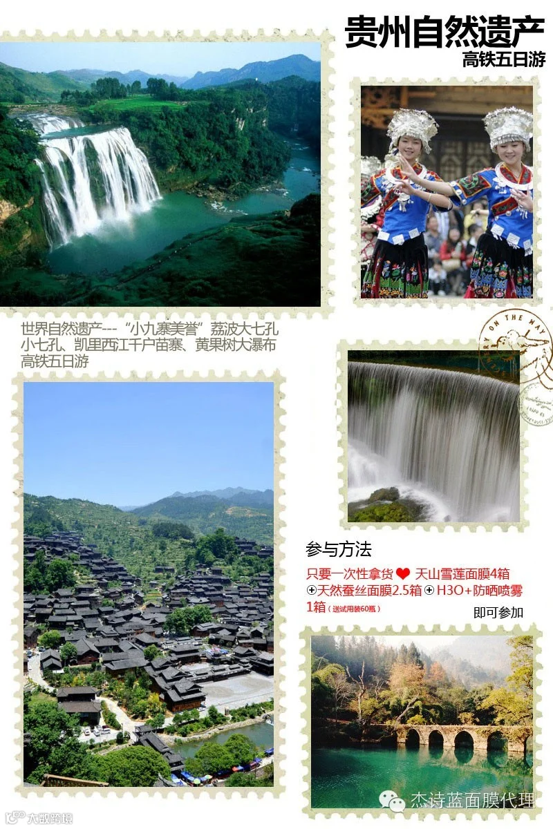8、贵州省五日游:4箱天山雪莲面膜 + 2.5箱天然蚕丝面膜 + 1箱H3O+防晒喷雾(送60瓶试用装)