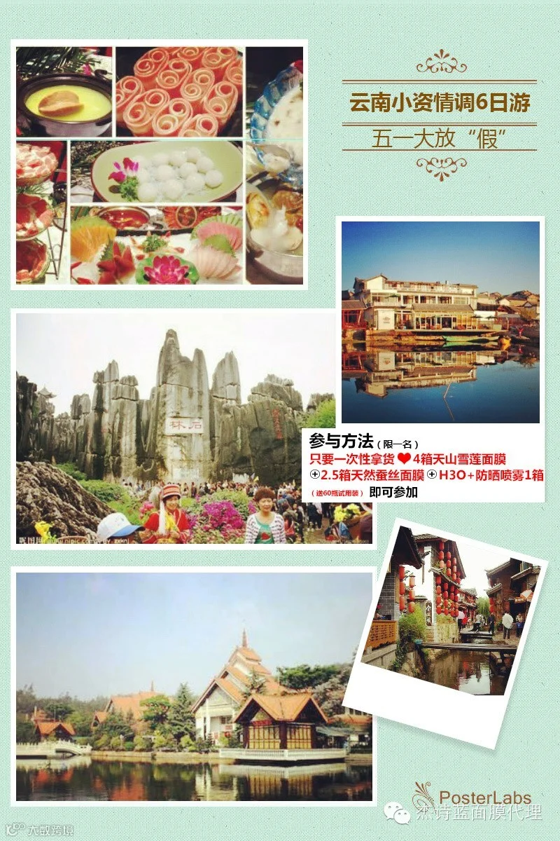 7、云南省五日游:4箱天山雪莲面膜 + 2.5箱天然蚕丝面膜 + 1箱H3O+防晒喷雾(送60瓶试用装)