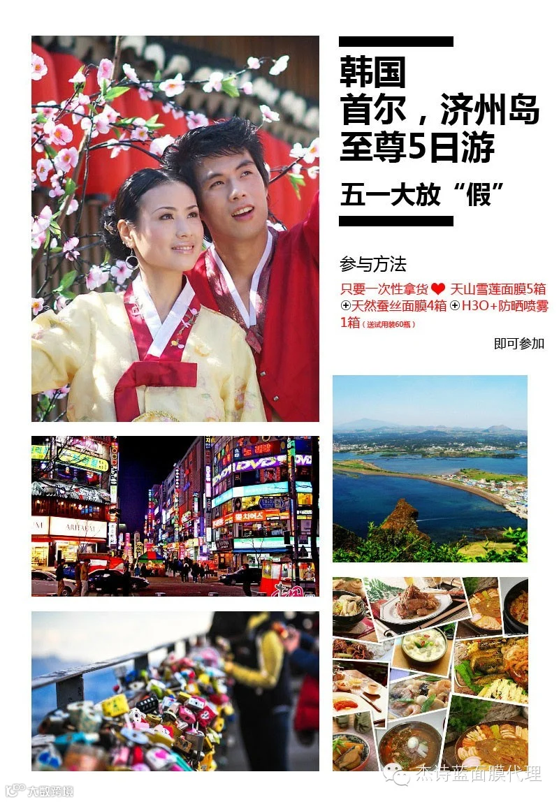 4、韩国五日游:5箱天山雪莲面膜 + 4箱天然蚕丝面膜 + 1箱H3O+防晒喷雾(送60瓶试用装)