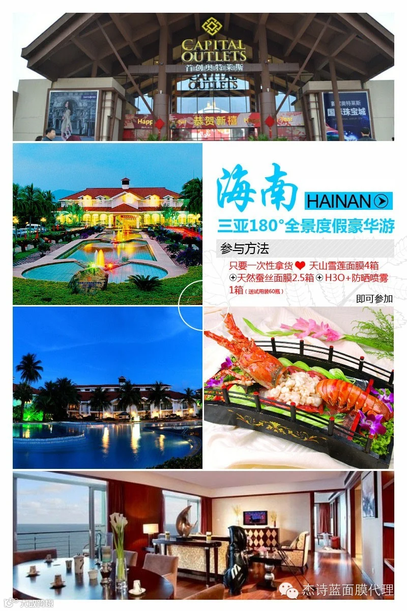 6、海南岛四日游:4箱天山雪莲面膜 + 2.5箱天然蚕丝面膜 + 1箱H3O+防晒喷雾(送60瓶试用装)