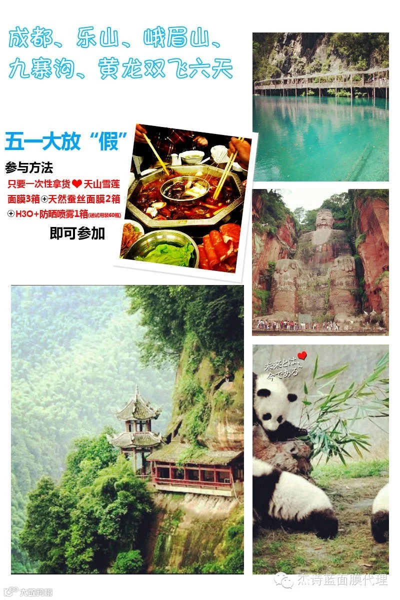 9、四川九寨沟六日游:3箱天山雪莲面膜 + 2箱天然蚕丝面膜 + 1箱H3O+防晒喷雾(送60瓶试用装)
