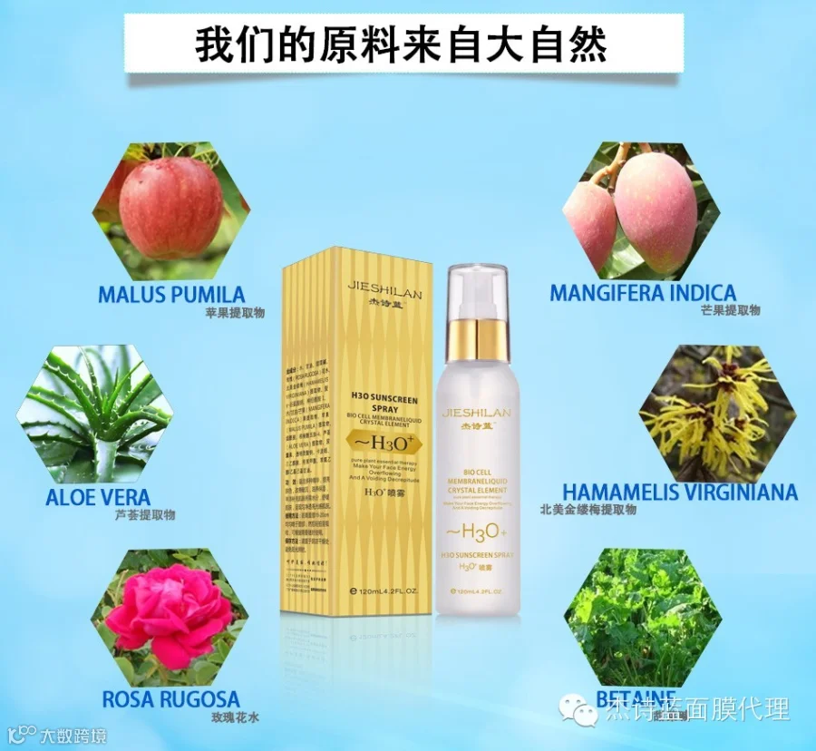 产品成分:苹果提取物,芦荟提取物、芒果提取物、玻璃花水、北美金镂梅提取物、甜菜碱。