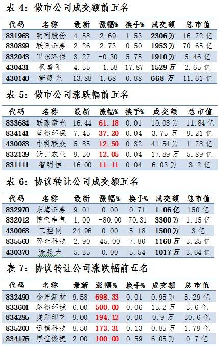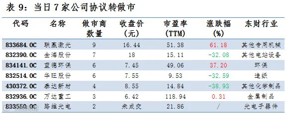 点评:7家公司协议转做市,3家上涨、3家下跌、1家正常交易未成交,联赢激光与蓝德环保做市首日涨幅较大居做市公司涨幅前2名,泰达新材、华旺股份、金海股份做市首日跌幅较大居做市公司跌幅前三名。