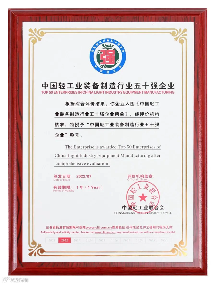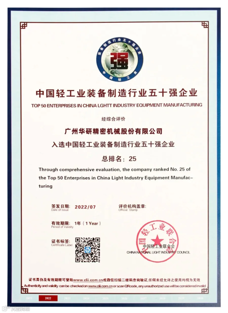 近日,中国轻工业联合会在北京召开了中国轻工业百强企业高峰论坛,隆重发布了2021年度中国轻工业百强、轻工业科技百强、轻工业装备制造五十强等榜单。广州华研精密机械股份有限公司荣膺“2021年度中国轻工装备制造行业五十强企业”,位列第25名。