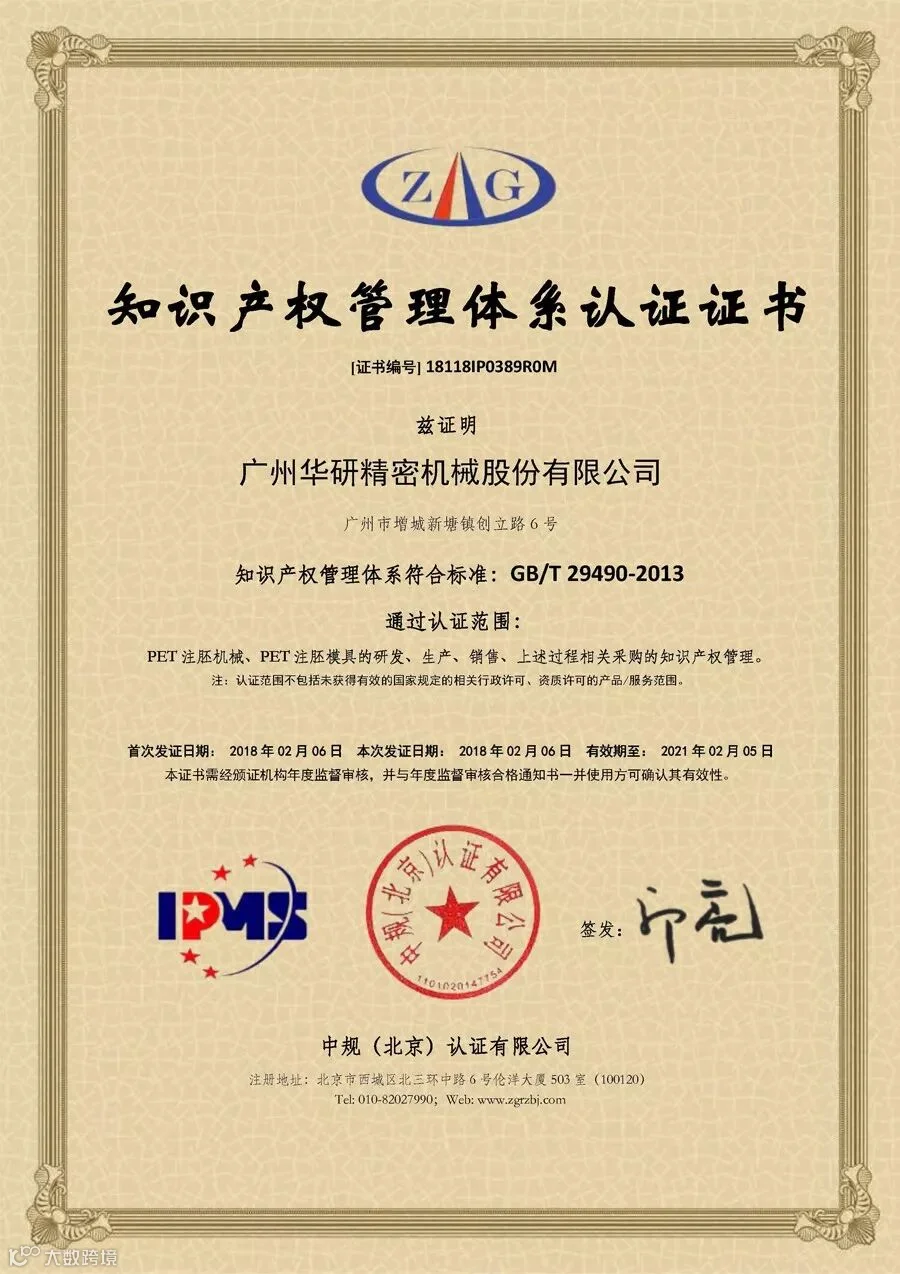 近日,广州华研精密机械股份有限公司顺利通过中规(北京)认证有限公司的知识产权管理体系评审,获得GB/T29490-2013知识产权管理体系认证证书(证书号码:18118IP0389ROM)。