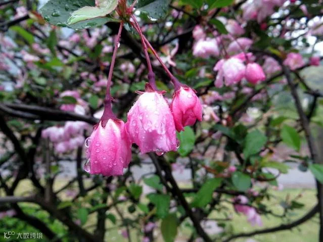 突然,一片粉红色的桃花映入眼帘。心情一下子好起来。只见山岭上层层叠叠,粉一片,绿一片,桃花盛开;山谷中红的黄的绿的色块如诗如画般在你眼前铺展。据说这桃树是国外引进的品种,能结出又甜又香的大桃呢。