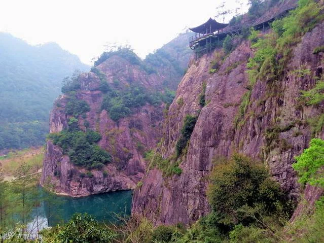 沿着山路前行,青竹、溪流、山岩真如小三峡一般。突见一危岩在溪谷中拔地而起,姿态雄奇,擎天高耸,因形似船桅,故名石桅岩,其相对高度306米,呈浅红色,岩顶如并蒂莲蕾,比肩而耸。此岩有“浙南天柱”之誉。看时,果然气势非凡。