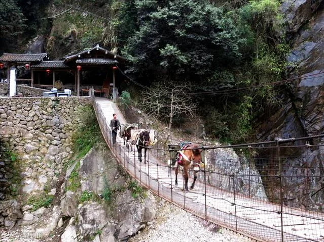司机给我们介绍,外脆里嫩、油而不腻的烤全羊是当地极具风味的特色菜。每到周末,能容纳1000人的11家岭上人家农家乐几乎全部爆满,停在公路边的汽车长达几公里。当地烤全羊以本地山羊为原料,采用独特配方炭烤而成,可谓色香味俱全。可惜我们离吃饭时间还远,无缘品尝。村民与外界联系的唯一渠道就是一个架在山与公路之间的吊桥。挑担的、赶马的,行人游客都要走过这个吊桥,让人感到了世外桃源的意境。