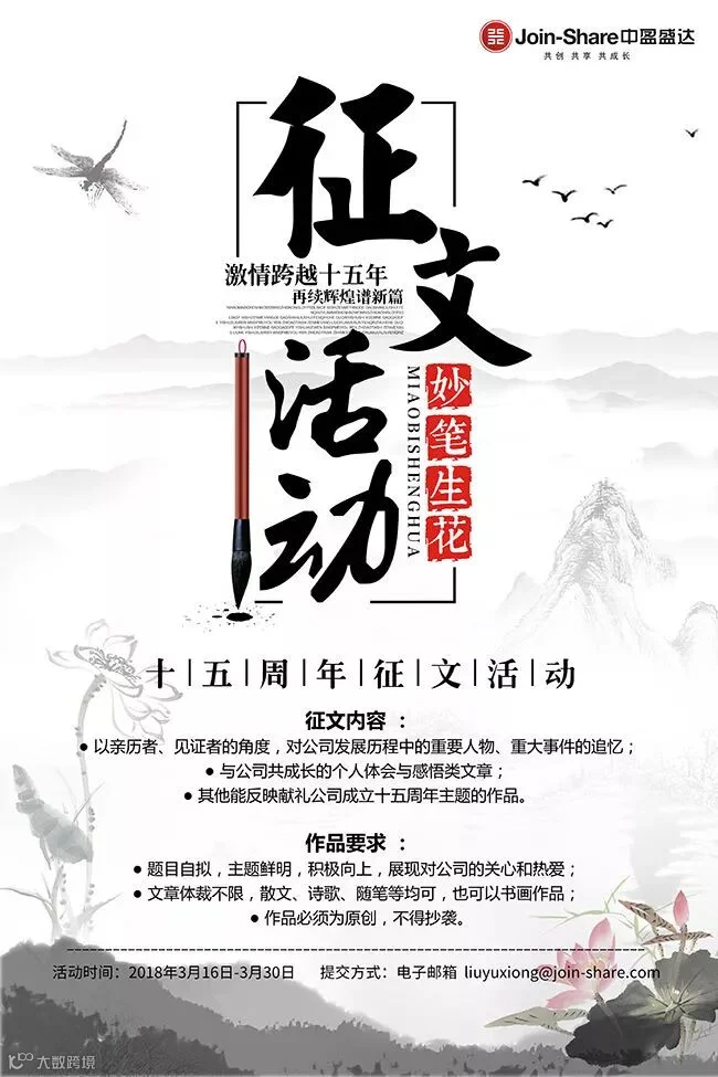 为了分享公司成长历程,讴歌公司发展成果,现向社会友人及全体员工征集作品,共同为公司成立十五周年献礼!