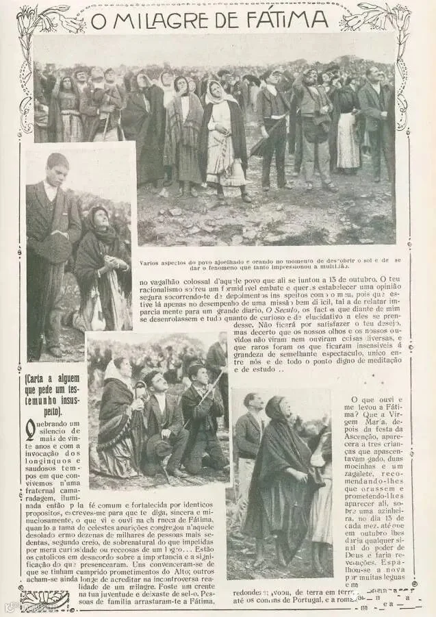 里斯本日报O Dia关于1917年10月17日的特殊报道说:“……银色的太阳被同样刺眼灰色的光包围,好像在旋转,在裂开的云里转动……光转化成美丽的蓝色,好像是通过大教堂里着色的玻璃窗,照向跪下,伸出手的人群……人群哭泣,光头祈祷,面向着他们等候的奇迹。秒好像成为小时,它是如此生动。”