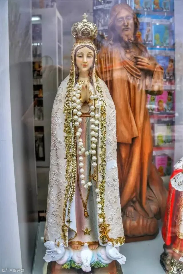 法蒂玛圣母大殿 ,殿的塔高 65 米,始建于1928年,在1953年10月祝圣。正中是耶稣圣心像 。