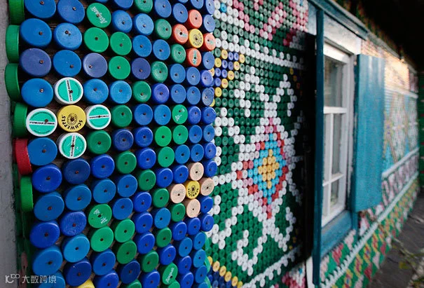 这是一位退休老人Oga Kostina用30,000个塑料瓶盖装饰了自己的房子——多彩的图案和纹样让乡村的小屋成为当地小有名气的地标建筑。