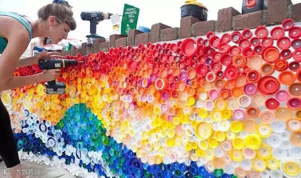 瓶盖的装饰也是艺术家常用的方式,Hurricane Sandy利用回收的瓶盖DIY的艺术墙,这个工作其实不简单哦。