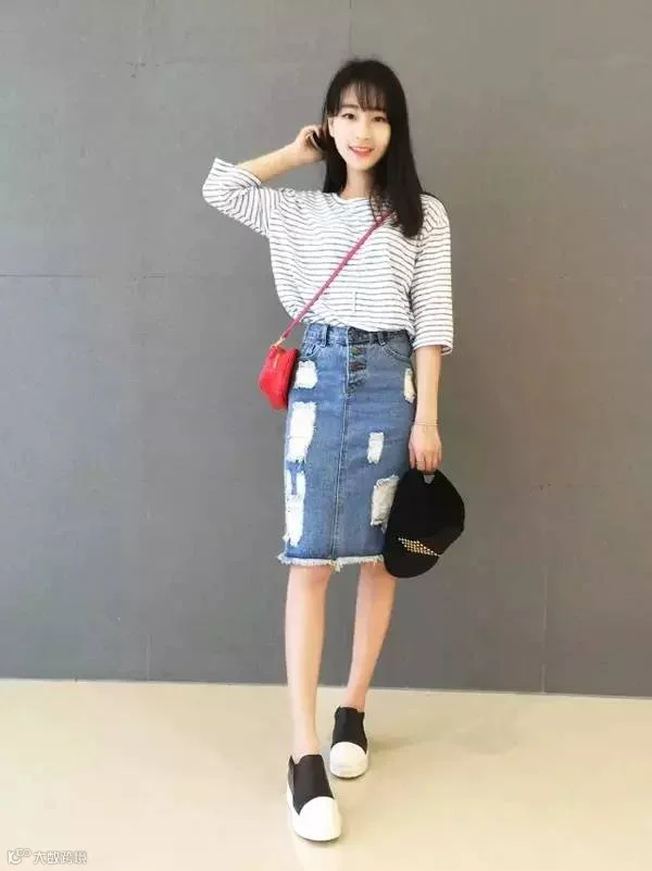 个子较高的女生不建议穿太短的裙子,第一是怕走光,第二会有风尘味!一条充满趣味的及膝破洞裙很减龄啊~