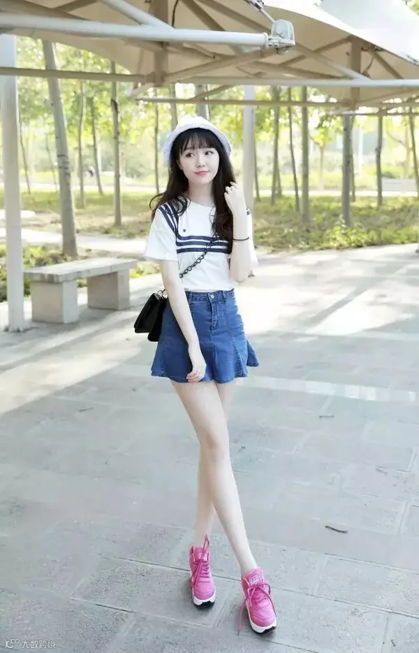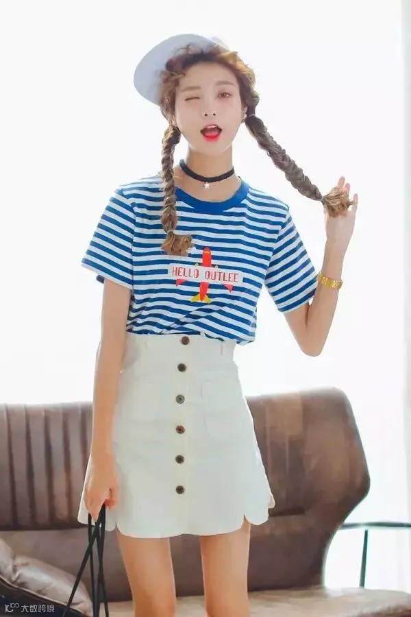 寻常的白t恤在加了三道蓝色的海军风条纹衫时瞬间变得高大上了!配上荷叶边的牛仔裙,减龄效果大家看得见!