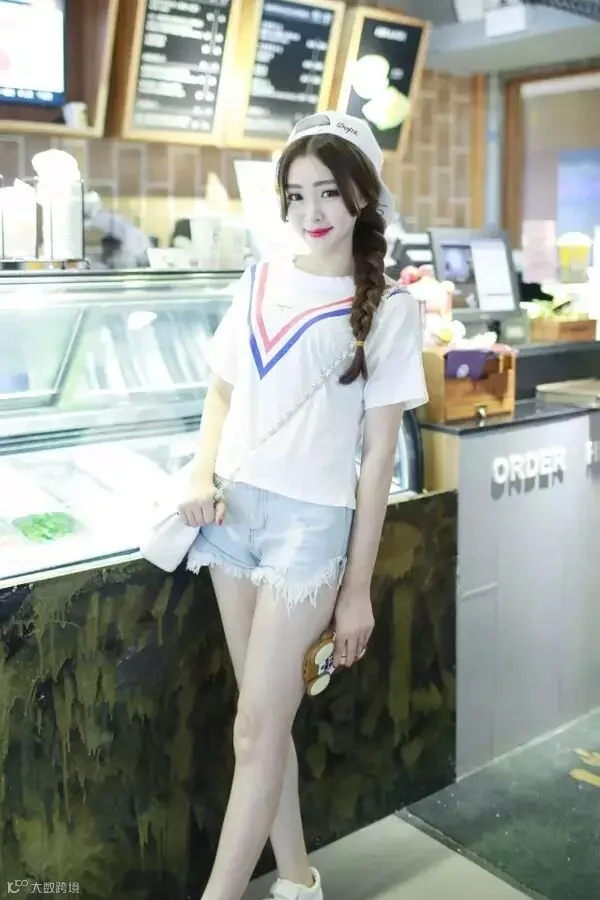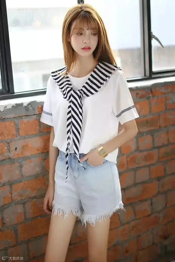 很简约的一款海军风t恤配上清爽的渐变色蓝牛仔热裤,加上一条海军领,瞬间减龄五岁!