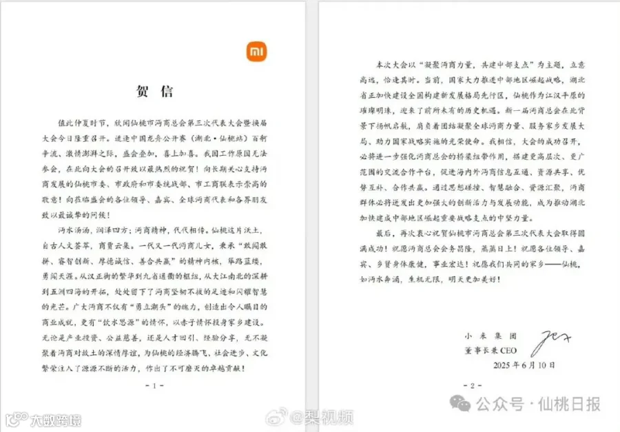 沔商总会名誉会长雷军先生发来贺信,并派特别代表参会。