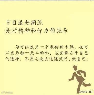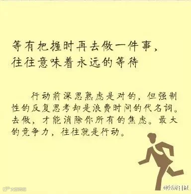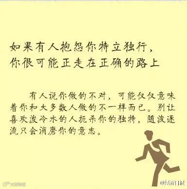 【9句话点醒困惑的你】①等有把握再去做一件事,往往意味着永远的等待;②一定要有自己的方向;③努力加倍,期望减半;④如果有人抱怨你特立独行,你很可能正走在正确的路上;⑤很多事情没有你想象的那么严重;⑥试图取悦别人是徒劳无益的做法……戳图收藏↓↓时刻提醒自己。