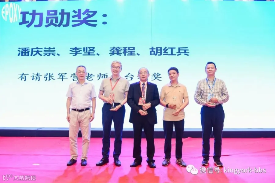 市金永固新材料有限公司胡红兵总经理与潘庆崇、李坚、龚程等几位老师一起荣获功勋奖,以表彰他们一直以来对于环氧树脂应用会议的大力支持。